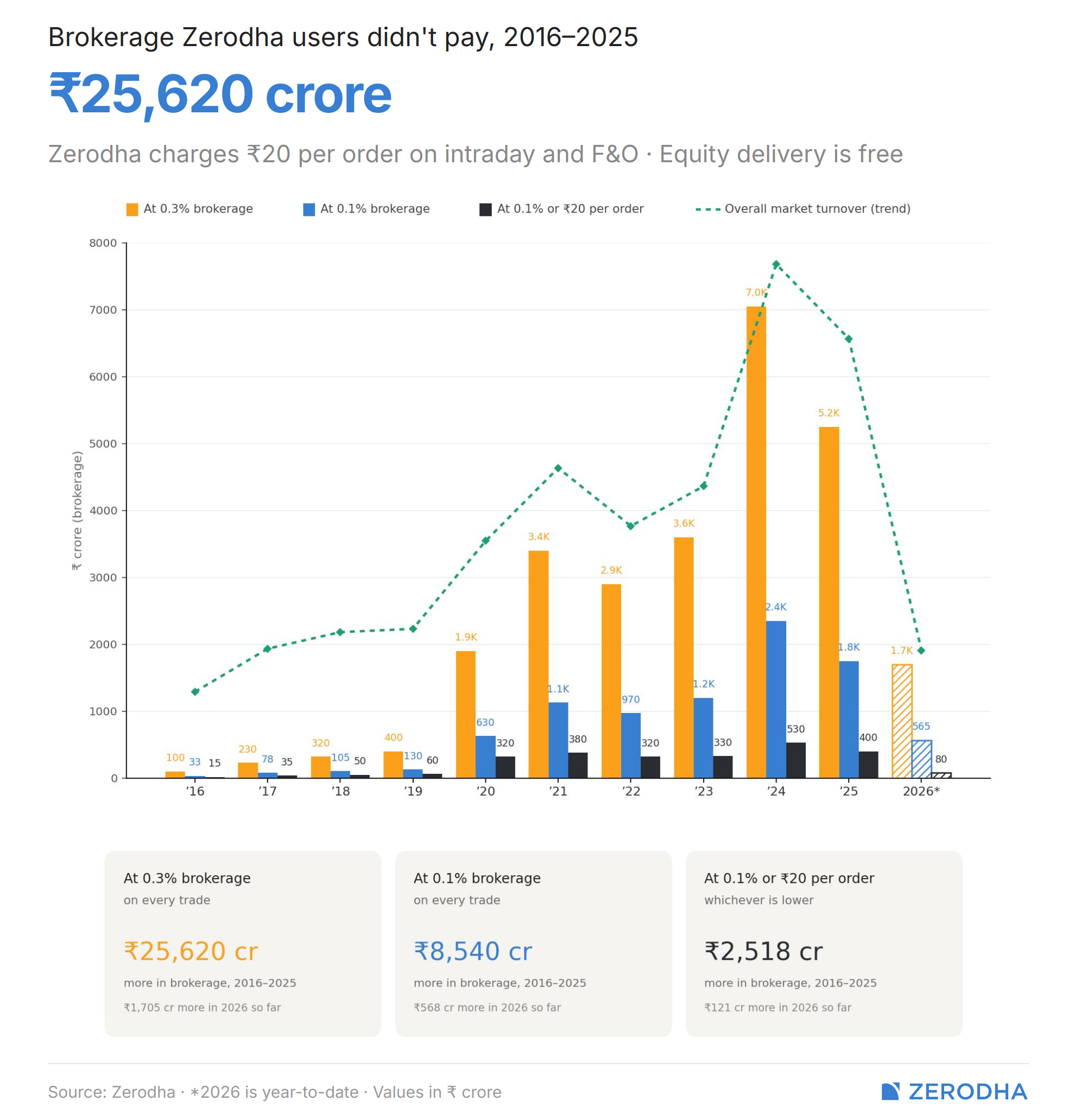 Just out of curiosity, we looked at how much Zerodha customers saved in brokerage because we don’t charge for equity delivery trades.