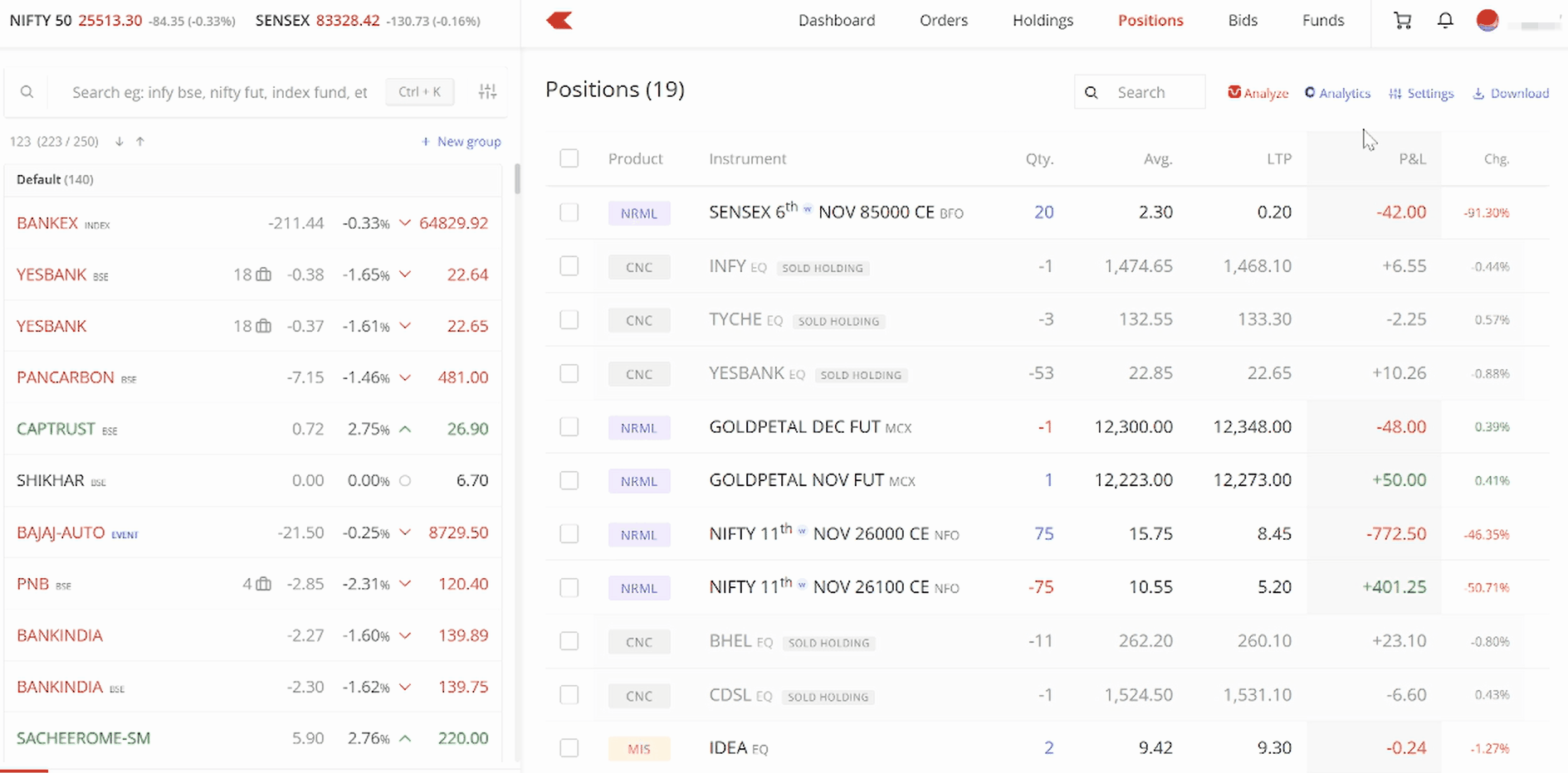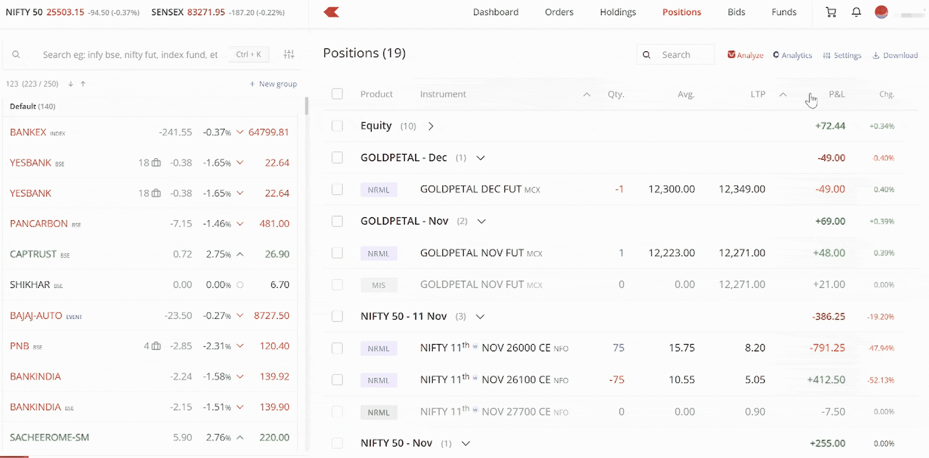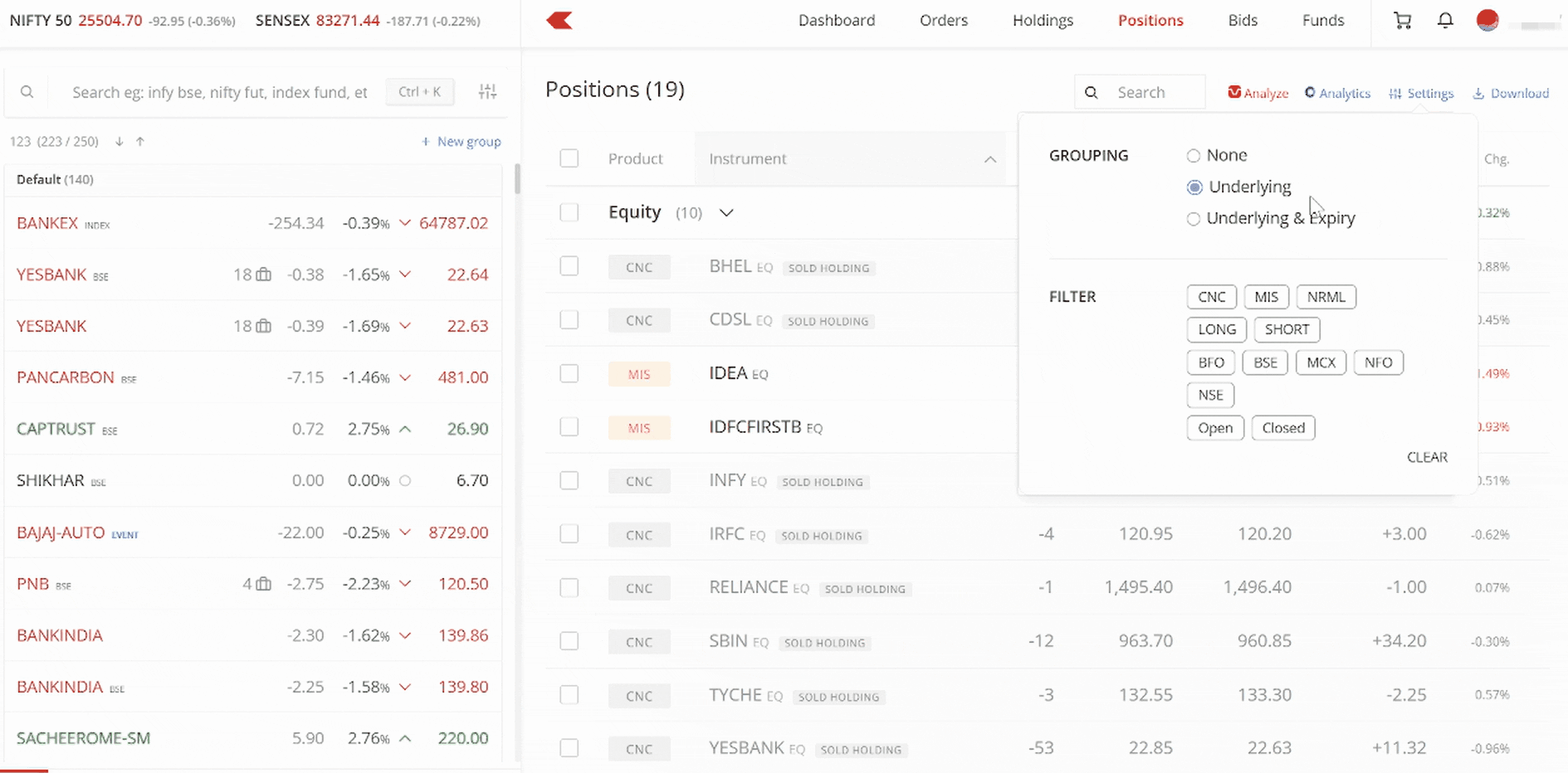 Select “Underlying” to group all positions of the same instrument. For instance, if you trade Nifty and Sensex F&O contracts across expiries, each will appear under its group with a combined P&L for that group beside it.